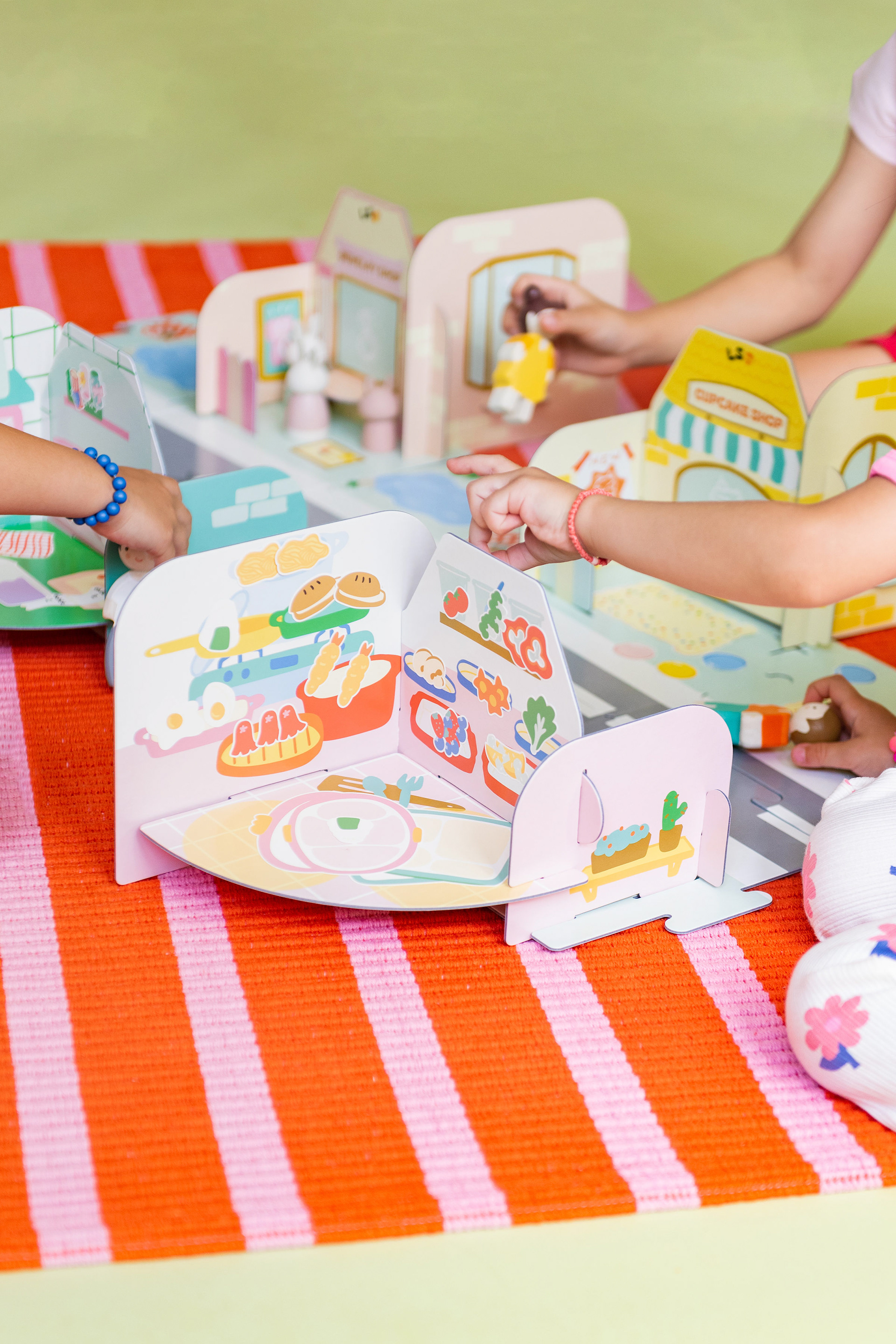 I invested in a cutting machine, high-quality printer, and a lot of sticker paper to create a solid prototype. Through R&D, I made several improvements, and the biggest decision was to turn the project into a dollhouse instead of a book, making playtime longer and more interactive. Now, with various shops, kids can not only become shop owners, but also the mayor of their own little town! And instead of playing alone, they can invite friends to join them in their growing town.
