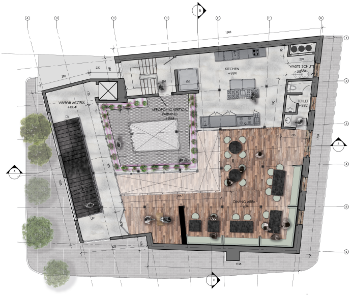 Roof top garden act as community garden and outdoor place to eat or having an outdoor event. It is accessible also for public to just enjoy a walk in our garden. Community garden is a place where Re- Wa visitors could grow their own herbs and vegetables. It is grown using our fertilizer processed from our food waste. The produces own by visitors could also be given to our kitchen to be process.