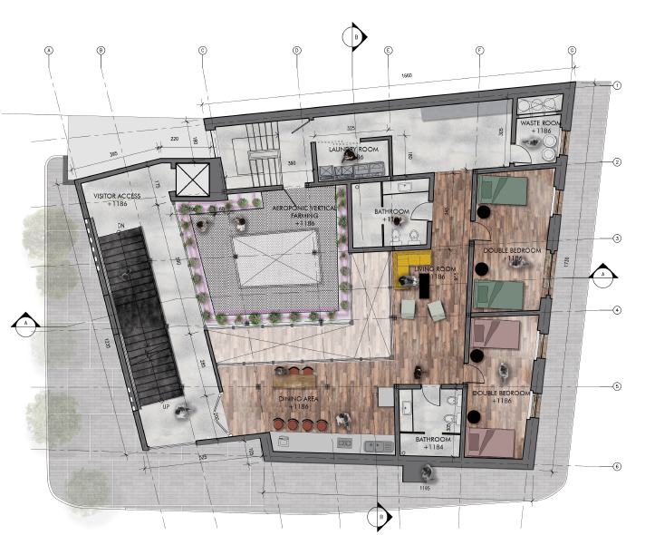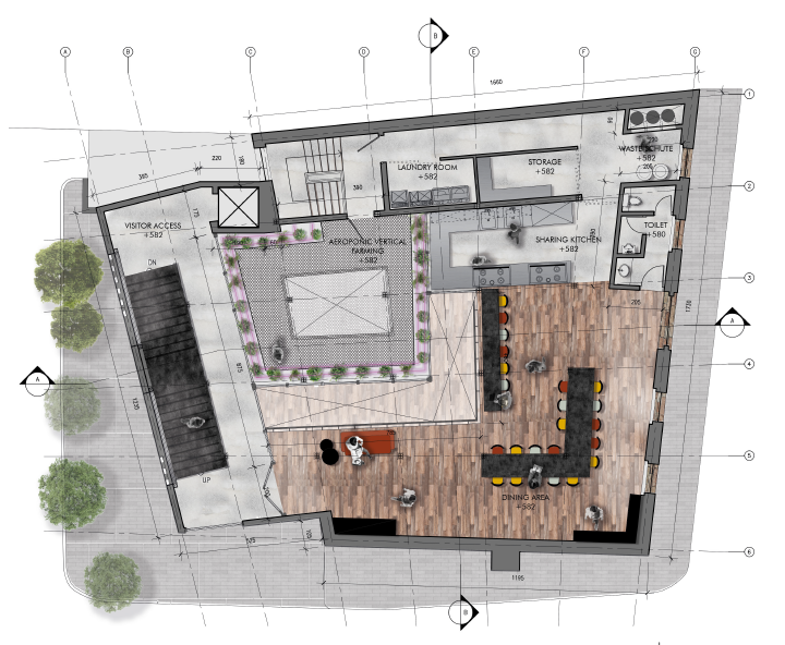 Co-living apartment acommodate a temporary place to live for the workers inside the building in a sharing way of living reducing waste and energy consume. With the co-living space, chef, farmer, and other Re-Wa workers could have a decent place to rest and socialize with their colleague.