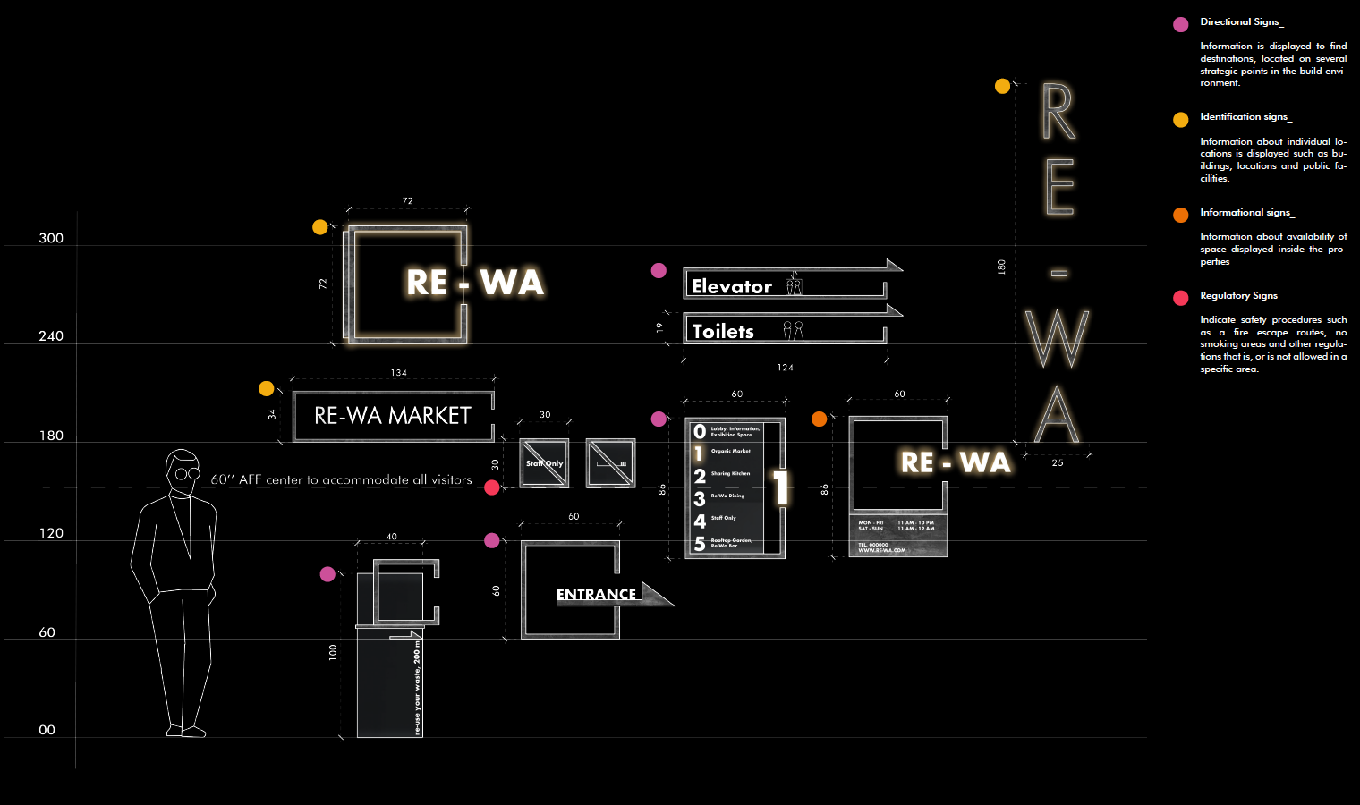 Variation of signage proportion consist of Identification sign, Informational Sign, Directional Sign, and Regulatory Sign.
