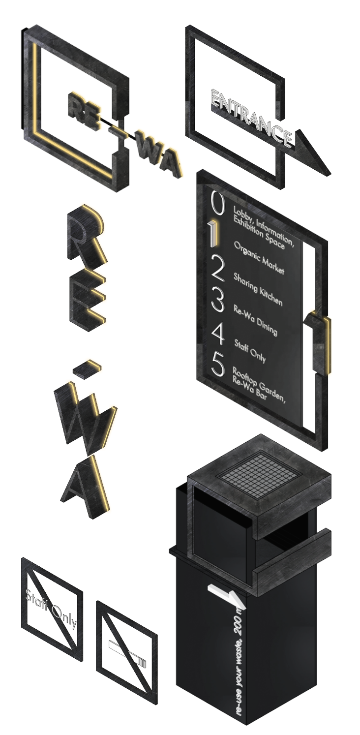 Re-Wa Directional signs in Urban Context consist of information about Re - Wa location in form of trash bin as an urban furniture. It is connected to Re - Wa main concept in waste management. Located in strategic busy pedestrian in 200 meters radius from the building, we put each trash bin with a message to get people awareness of reducing waste while giving direction of Re - Wa location.
