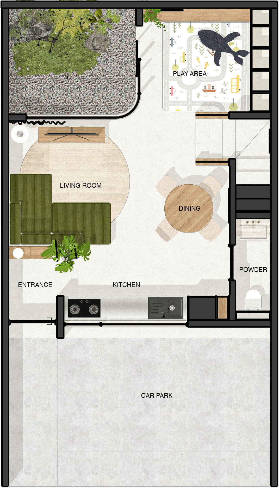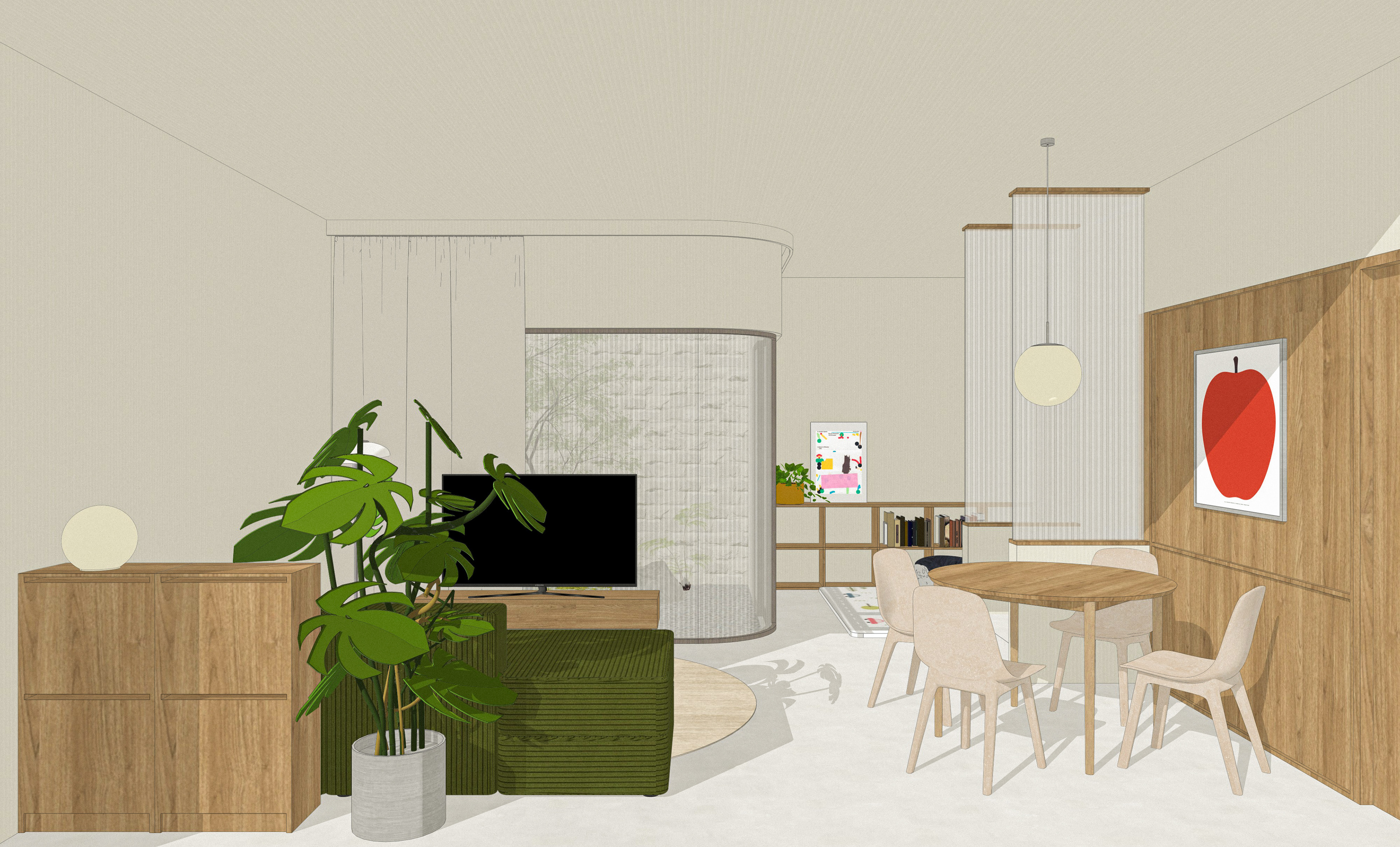 This interior design project is intendedĀ for a compact home suitable for a family of four, including a toddler and a baby. The design concept focuses on creating a seamless, open-plan living space that promotes family interaction and safety. By incorporating an open layout, parents can easily supervise their children while engaging in daily activities, fostering a sense of togetherness.